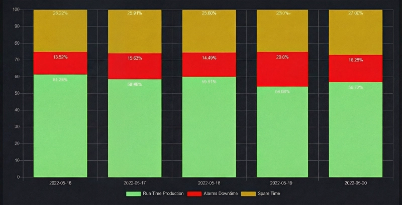 Επίσης, η παρακολούθηση αποδίδεται σε όρους χρόνου, όπου μπορείτε εύκολα να έχετε πρόσβαση σε γρήγορους και αργούς χρόνους παραγωγής, χρόνους διακοπής λειτουργίας και διάρκεια συναγερμού. Επιπλέον, περιλαμβάνονται σημαντικές πληροφορίες σχετικά με τις καταναλώσεις υλικών, τους αριθμούς παρτίδων, τις παρτίδες, τους προμηθευτές ή ακόμη και σχόλια και εικόνες από τους χειριστές.