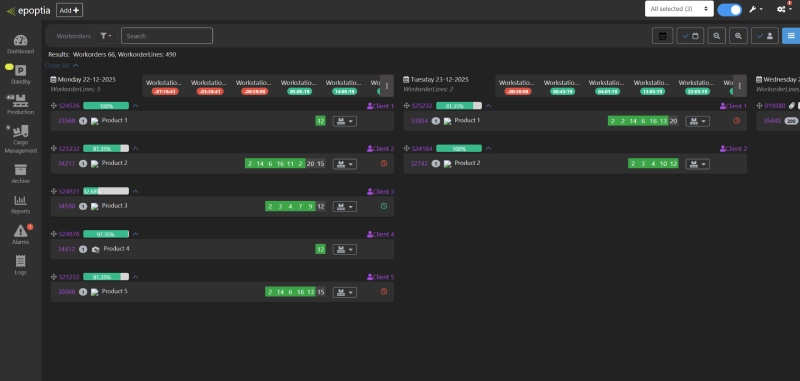 Το Epoptia χρησιμοποιεί τους πόρους σας για την ελάχιστη απώλεια διαθεσιμότητας ανάλογα με την ημέρα-στόχο, την απόδοση των υλικών και τη διαθεσιμότητα των προηγούμενων σταδίων παραγωγής. Πρόκειται για ένα αποδεδειγμένο εργαλείο που μειώνει δραματικά τους χρόνους παράδοσης, αξιοποιεί τους πόρους σε υψηλότερο επίπεδο και βελτιώνει την παραδοσιμότητα.